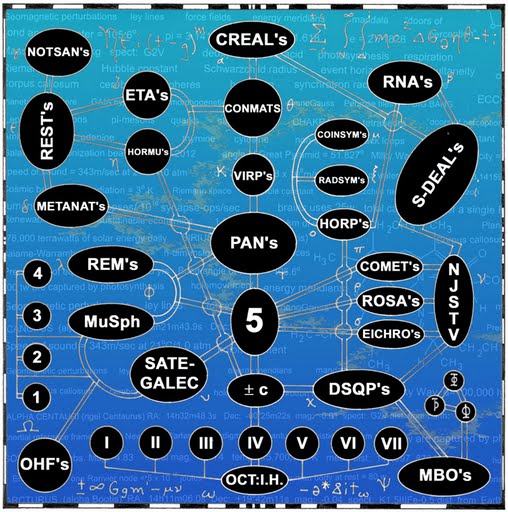 In the circle in the center we have the "I", the "unified holographic operator" which represents not only each individual human being, but also every sentient being, every life-form, every monad/holon, as well as the highest level of awareness in the multiverse"you can call it what you want! The Supreme Becoming. But not the one of any certain religion or spiritual psychology; this is a more abstract, conceptual and non-anthropomorphic conceptualisation of divinity. Each little "I" is a low-resolution hologram of the Big "I". We contain the whole but the whole is greater than each of us. This "I" is the "self" in a Jungian sense; it is the "participant/observer" of modern quantum physics; it is the "monad" of Liebniz and the "holon" of Arthur Koestler [in his book Janus: A Summing Up Koestler gives his systems theory model in which every individual being or entity, from an atom up to a galaxy is a unique "holon" which has simultaneously complementary characteristics, what he called "self-assertive" tendencies which separate and define each holon as discrete, and "integrative" tendencies which are the ways that each individual holon fits into or exists as a part of something that is greater than itself].