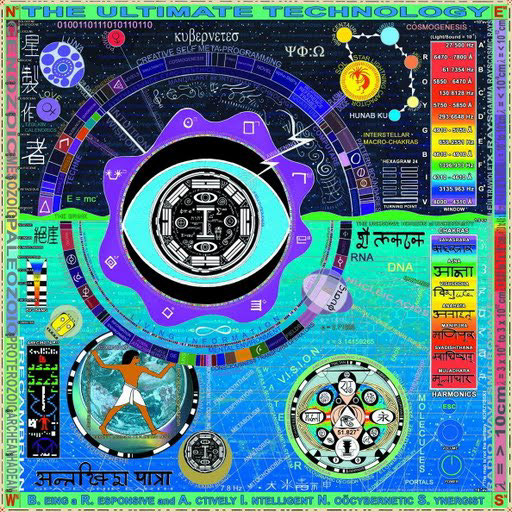 This image is an analog/digital hybrid, consisting of multiple layers of hand-drawn patterns and meticulously assembled scans and texts. It was done primarily in Photoshop5.5 but with text-wrapping done in Adobe 9.0. It represents hundreds of man-hours of work. It is a spacecraft control panel for your mind/brain, and it is also a mandala. It is also a meta-mind-map, a star-chart for inner space. Jose Arguelles wrote a chapter entitled "Art as Internal Technology" in his book The Transformative Vision. This is the spirit of this image: a tool for inner exploration and self-actualization. Our sense of vision operates in a mode of simultaneity which helps us to grasp complex patterns and relationships more coherently. This image contains a multitude of associational matrices; it is an evolutionary instrument for mind navigation."The map is not the territory." Korzybski- "In the province of the mind, there are no limits." John C. Lilly- "Don't be a soldier in World War 3, park your car and plant a tree;